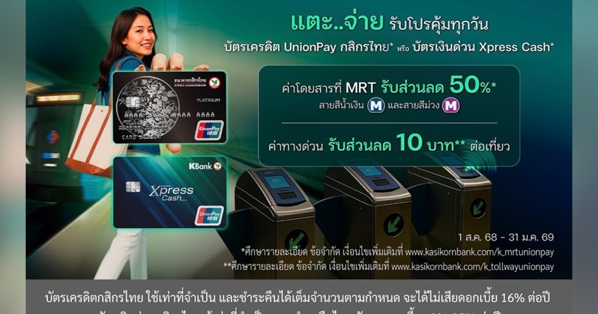 บัตรเครดิต UnionPay กสิกรไทย* และบัตรเงินด่วน Xpress Cash* ช่วยลดค่าใช้จ่ายคนเมือง! แตะจ่ายรถไฟฟ้า MRT ได้แล้ว รับส่วนลด 50% และจ่ายค่าทางด่วน รับส่วนลด 10 บาทต่อเที่ยว
