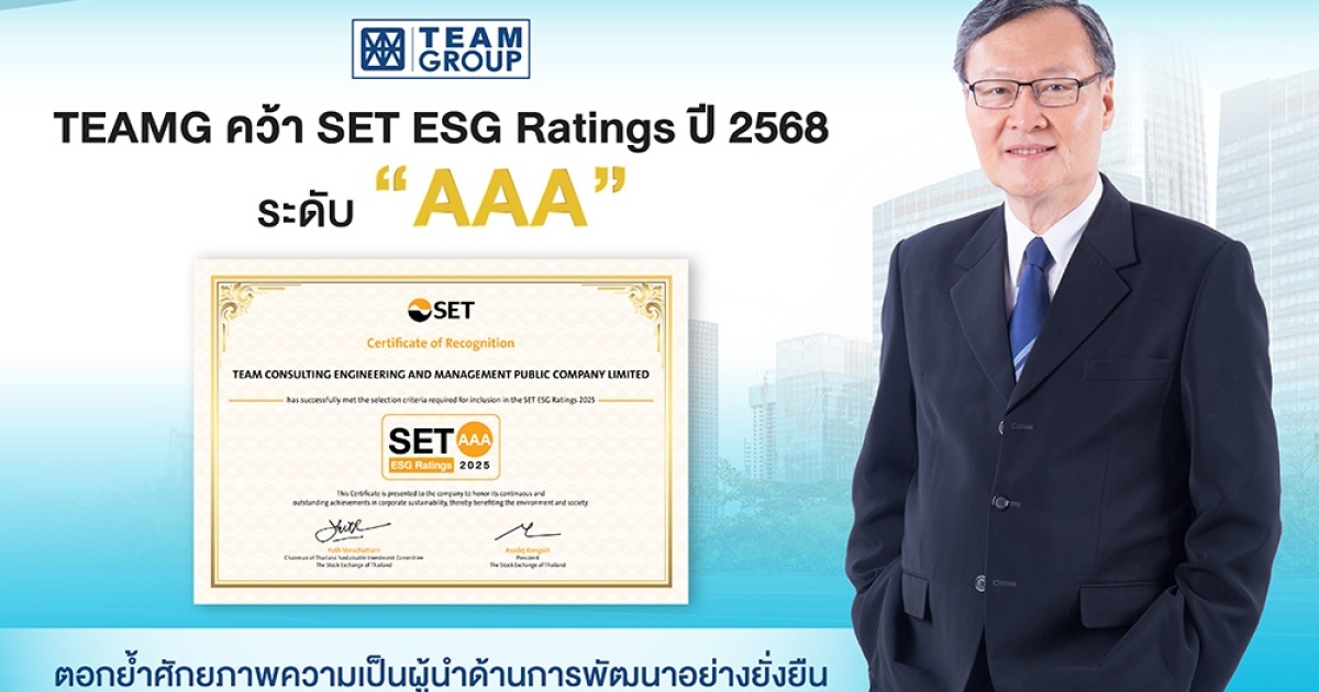 TEAMG ตอกย้ำความโดดเด่นด้านการพัฒนาอย่างยั่งยืน คว้าผลประเมินหุ้นยั่งยืน SET ESG Ratings ประจำปี 2568 ระดับ “AAA” สะท้อนถึงความมุ่งมั่นในการดำเนินธุรกิจอย่างรับผิดชอบ โปร่งใส และยึดหลักธรรมาภิบาล พร้อมส่งเสริมการใช้ทรัพยากรอย่างมีประสิทธิภาพและสร้างคุณค่าทางสังคมอย่างต่อเนื่อง