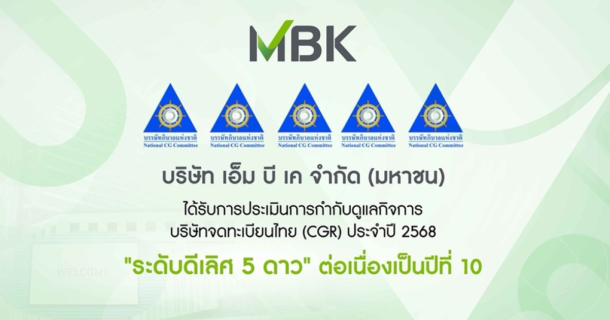 บริษัท เอ็ม บี เค จำกัด (มหาชน) กลุ่มบริษัทชั้นนำของประเทศที่เติบโตอย่างมั่นคง มุ่งมั่นในการลงทุนและประกอบธุรกิจที่ให้ผลตอบแทนอย่างยั่งยืน ได้รับคะแนนการประเมินการกำกับดูแลกิจการในระดับ 5 ดาว หรือ “ดีเลิศ” (Excellent CG Scoring) ต่อเนื่องเป็นปีที่ 10 จากสมาคมส่งเสริมสถาบันกรรมการบริษัทไทย (IOD) โดยการสนับสนุนจากตลาดหลักทรัพย์แห่งประเทศไทย ได้เปิดเผยผลการสำรวจด้านการกำกับดูแลกิจการของบริษัทจดทะเบียนไทย ประจำปี 2568 (Corporate Governance Report of Thai Listed Companies 2025 : CGR) ตอกย้ำให้เห็นถึงบริษัท ฯ มีมาตรฐานและการยึดมั่นในหลักการกำกับดูแลกิจการที่ดี มีธรรมาภิบาล มีความโปร่งใส เพื่อสร้างความเชื่อมั่นให้แก่ผู้มีส่วนได้เสียอย่างต่อเนื่อง ควบคู่ไปกับการดำเนินธุรกิจเพื่อให้องค์กรเติบโตอย่างยั่งยืน