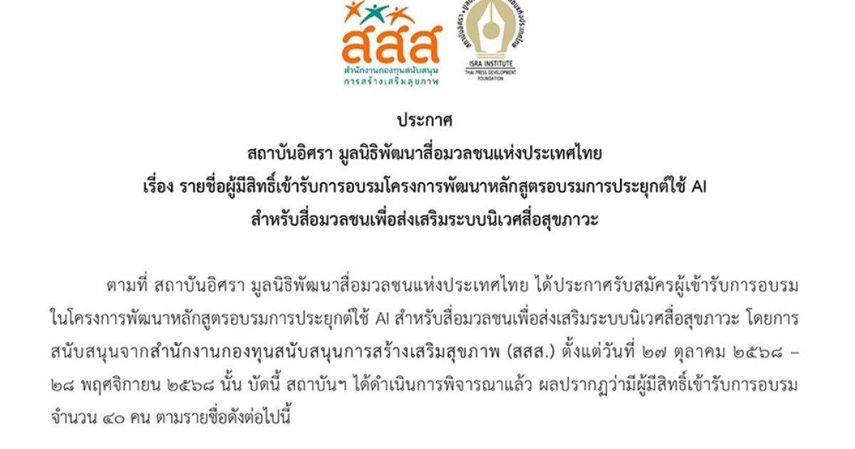 ตามที่ สถาบันอิศรา มูลนิธิพัฒนาสื่อมวลชนแห่งประเทศไทย ได้ประกาศรับสมัครผู้เข้ารับการอบรม ในโครงการพัฒนาหลักสูตรอบรมการประยุกต์ใช้ AI สำหรับสื่อมวลชนเพื่อส่งเสริมระบบนิเวศสื่อสุขภาวะ โดยการสนับสนุนจากสำนักงานกองทุนสนับสนุนการสร้างเสริมสุขภาพ (สสส.) ตั้งแต่วันที่ 27 ตุลาคม 2568 – 28 พฤศจิกายน 2568 นั้น บัดนี้ สถาบันฯ ได้ดำเนินการพิจารณาแล้ว ผลปรากฏว่ามีผู้มีสิทธิ์เข้ารับการอบรมจำนวน 40 คน ตามรายชื่อดังต่อไปนี้
