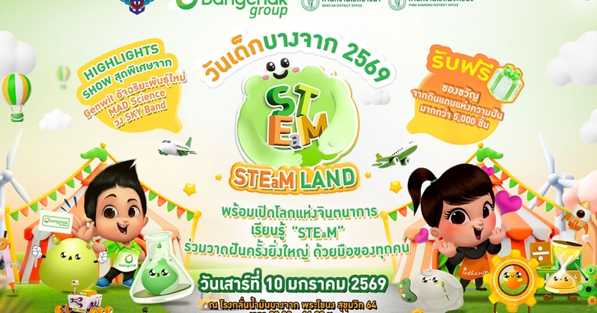 กลุ่มบริษัทบางจาก ขอเชิญชวนเด็ก ๆ และผู้ปกครอง ร่วมงานวันเด็กบางจาก ประจำปี 2569 ในวันเสาร์ที่ 10 มกราคม 2569 เวลา 08.00 - 11.30 น. ณ โรงกลั่นน้ำมันบางจาก พระโขนง สุขุมวิท 64 ภายใต้แนวคิด “STEaM Land” เปิดโลกแห่งจินตนาการ ชวนต่อยอดการเรียนรู้ในสาขาวิชาวิทยาศาสตร์ เทคโนโลยี วิศวกรรมศาสตร์ และคณิตศาสตร์ หรือ สะเต็มศึกษา ต่อยอดด้วยศิลปะผสมผสานกับศาสตร์ในการใช้ชีวิตและใส่ใจสิ่งแวดล้อม เพื่อพัฒนาอนาคตของเด็กไทยให้เติบโต มีความรู้ คิดสิ่งใหม่ ก้าวทันโลก