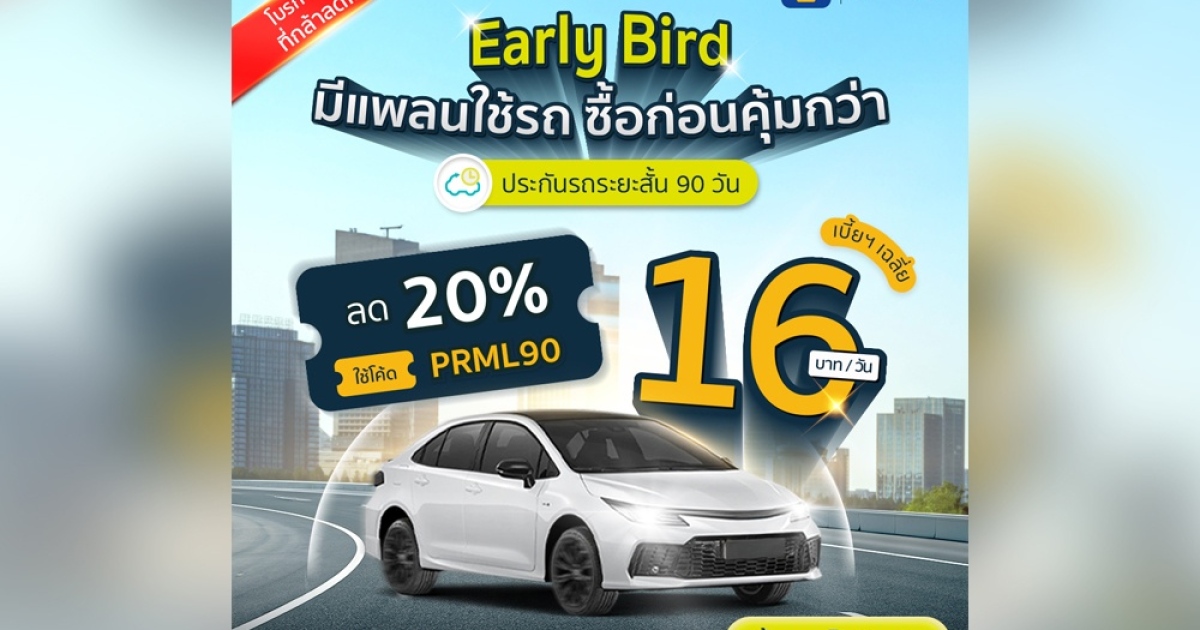 สำหรับผู้ที่วางแผนการใช้รถในช่วงนี้ไว้แล้ว ทาง gettgo ขอนำเสนอแคมเปญ Early Bird ส่วนลด 20% สำหรับประกันรถยนต์ระยะสั้น 90 วัน จากราคาแผนปกติ 1,850 บาท เหลือ 1,480 บาท หรือคิดเป็น ค่าเบี้ยเฉลี่ยประมาณ วันละ 16 บาท พร้อมความคุ้มครองตลอดระยะเวลา 90 วัน สามารถเลือกวันคุ้มครองล่วงหน้าได้ 90 วัน โดยผู้สนใจสามารถใช้โค้ด PRML90 ก่อนชำระเงินผ่านเว็บไซต์ https://s.gettgo.com/prmonthly90 ตั้งแต่วันที่ 23 มกราคม - 6 กุมภาพันธ์ 2569