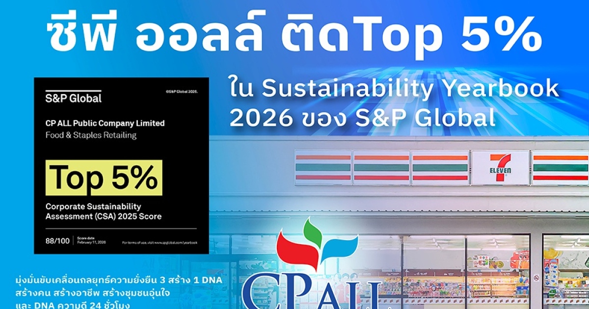 บริษัท ซีพี ออลล์ จำกัด (มหาชน) ผู้บริหารเซเว่น อีเลฟเว่น และเซเว่น เดลิเวอรี่ ยังคงแสดงให้เห็นถึงความมุ่งมั่นในการดำเนินธุรกิจโดยยึดหลักความยั่งยืนในทุกมิติด้วยการติด Top 5% ในกลุ่มอุตสาหกรรม Food & Staples Retailing ของ Sustainability Yearbook 2026 โดยมีคะแนน 88 คะแนน