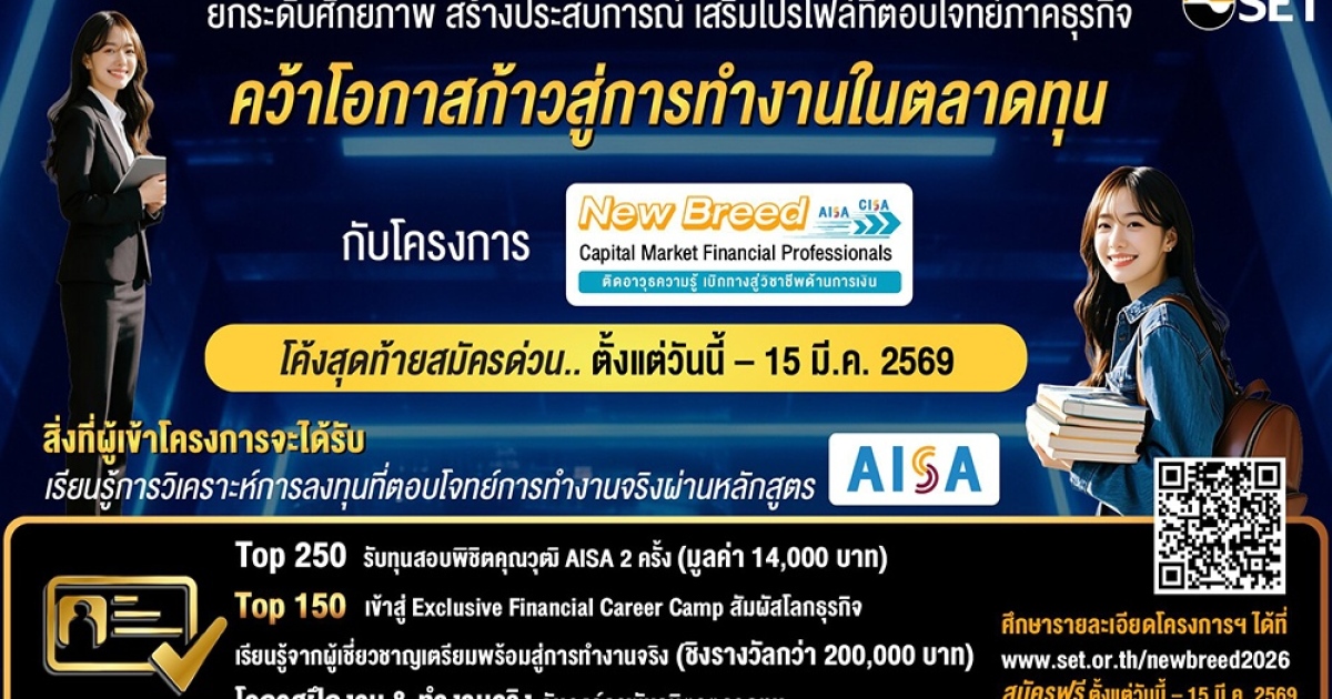 ตลาดหลักทรัพย์แห่งประเทศไทย ชวนนิสิต นักศึกษา และผู้ที่สนใจเริ่มต้นเส้นทางวิชาชีพด้านการเงิน สมัครเข้าร่วม "โครงการทุน New Breed Capital Market Financial Professionals 2026" เพื่อพัฒนาทักษะและความรู้สู่การเป็นบุคลากรคุณภาพในตลาดทุน