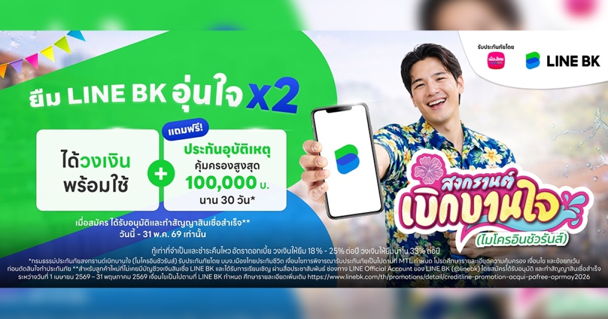 เมืองไทยประกันชีวิต ผนึกกำลัง LINE BK ส่งมอบ “กรมธรรม์ประกันภัยสงกรานต์เบิกบานใจ (ไมโครอินชัวรันส์)” ประกันภัยอุบัติเหตุกลุ่มที่ให้ความคุ้มครองครอบคลุมทั้งด้านชีวิตและค่ารักษาพยาบาล เนื่องจากอุบัติเหตุ สูงสุด 100,000 บาท นาน 30 วัน สำหรับลูกค้าที่สมัคร ได้รับอนุมัติ และทำสัญญาสินเชื่อใหม่กับ LINE BK รับสิทธิ์ ผ่านช่องทาง LINE BK Official Account เริ่มตั้งแต่วันที่ 1 เมษายน 2569 –31 พฤษภาคม 2569