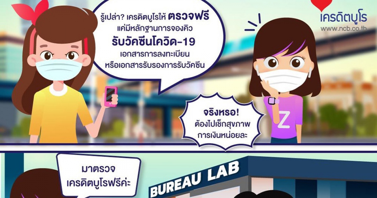 ตรวจเครดิตบูโรฟรี! ที่ศูนย์ตรวจเครดิตบูโรสถานีรถไฟฟ้า BTS (ภายในสถานี) เพียงแสดงหลักฐานอย่างใดอย่างหนึ่ง…หลักฐานการจองคิวนัดรับวัคซีนโควิด-19 ผ่าน e-Document (ไลน์ แอปพลิเคชัน ข้อความ SMS) เอกสารการลงทะเบียนจองคิวฉีดวัคซีนผ่านช่องทางอื่น เอกสารรับรองการได้รับวัคซีนโควิด-19 เพื่อยื่นแก่เจ้าหน้าที่เครดิตบูโร เพื่อรับรายงานเครดิตบูโรรูปแบบเอกสารฟรี! หรือรับอีคูปองเพื่อใช้บริการตู้คีออส เพื่อรับรายงานเครดิตบูโรรูปแบบอิเล็กทรอนิกส์ (NCB e-Credit Report) ฟรี! ทางอีเมลได้ทันที