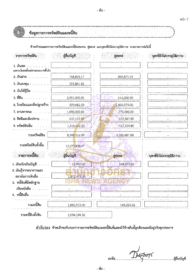 นายธนสุนทร และนางศรีสุดา สว่างสาลี คู่สมรส แจ้งมีทรัพย์สินทั้งสิ้น 12,275,439 บาท แจ้งมีหนี้สินทั้งสิ้น 2,054,196 บาท