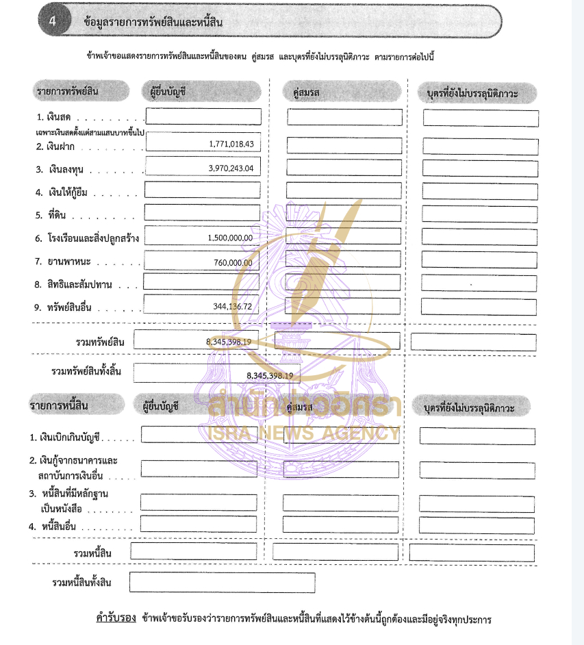 ทั้งนี้นายสุนทร แจ้งมีรายได้ต่อปีโดยประมาณ 1,962,000 บาท แจ้งมีรายจ่ายต่อปีโดยประมาณ 985,460 บาท นางศรีสุดา แจ้งมีรายได้ต่อปีโดยประมาณ 607,540 บาท แจ้งมีรายจ่ายต่อปีโดยประมาณ 442,887 บาท