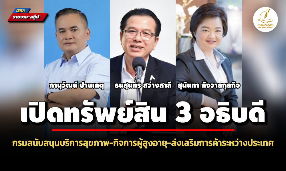 ป.ป.ช. เปิดทรัพย์สิน 3 อธิบดี 'ภานุวัฒน์ ปานเกตุ' กรมสนับสนุนบริการสุขภาพ ทรัพย์สิน 14.4 ล.-'ธนสุนทร สว่างสาลี' กรมกิจการผู้สูงอายุ ทรัพย์สิน 12.2 ล.-'สุนันทา กังวาลกุลกิจ' กรมส่งเสริมการค้าระหว่างประเทศ ทรัพย์สิน 8.3 ล.