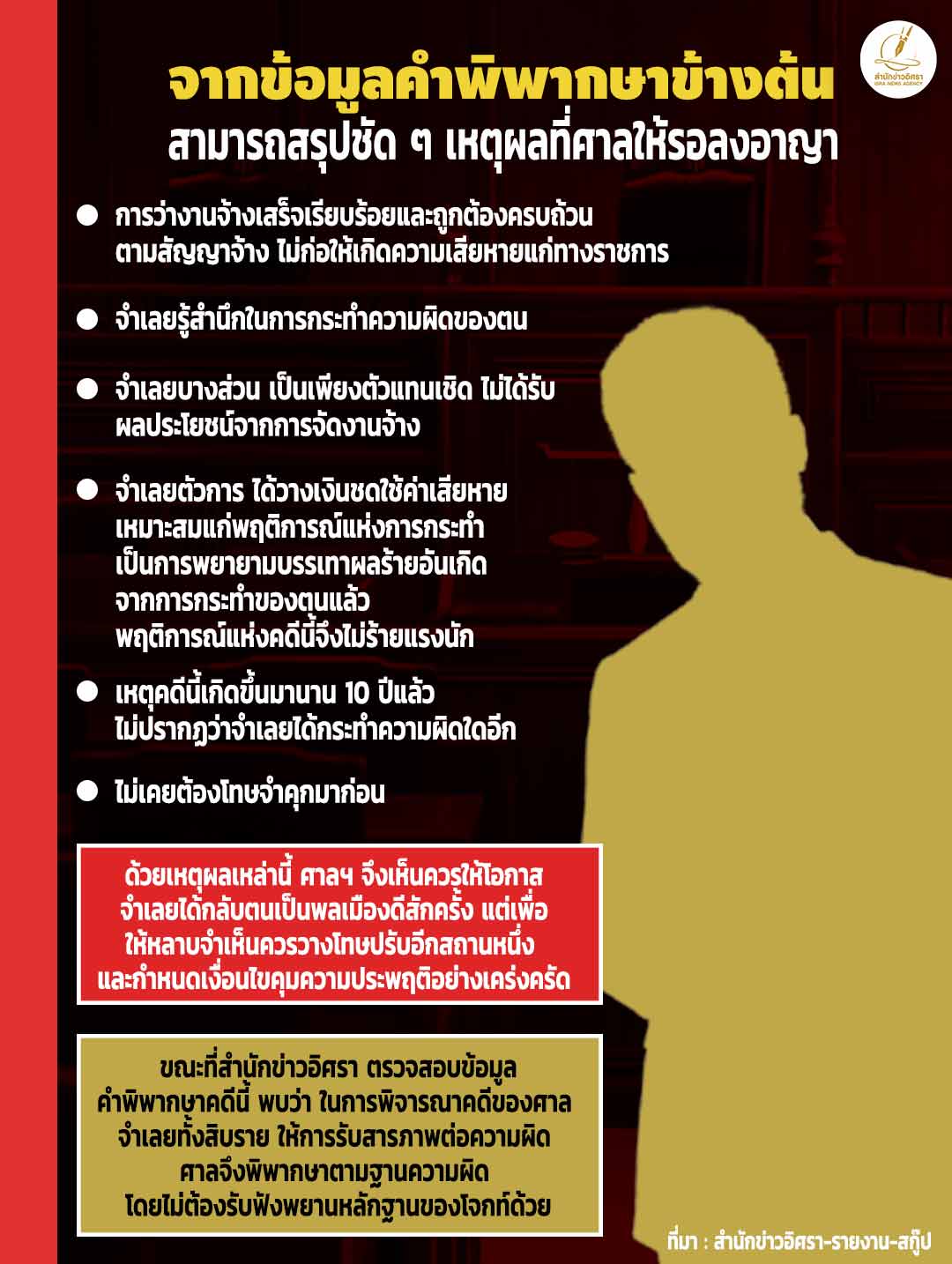 ทั้งหมดนี้ เป็นรายละเอียดคำพิพากษาในส่วนการวินิจฉัยตัดสิน ให้รอลงโทษ นายกิตติทัศน์ วิศาลนพศักดิ์ หรือ นายวัทธิกร หรือมังกร ใสงาม อดีตพาณิชย์จังหวัดอุบลราชธานี และพวก ในคดีนี้ ที่สำนักข่าวอิศรา ตรวจสอบพบล่าสุด