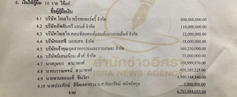 และแจ้งว่ามีคุณหญิงพจมาน ชินวัตร (นามสกุลและคู่สมรสในขณะนั้น) มีเงินให้กู้ยืม 10 รายการ รวม 6,707,984,035 บาท ได้แก่