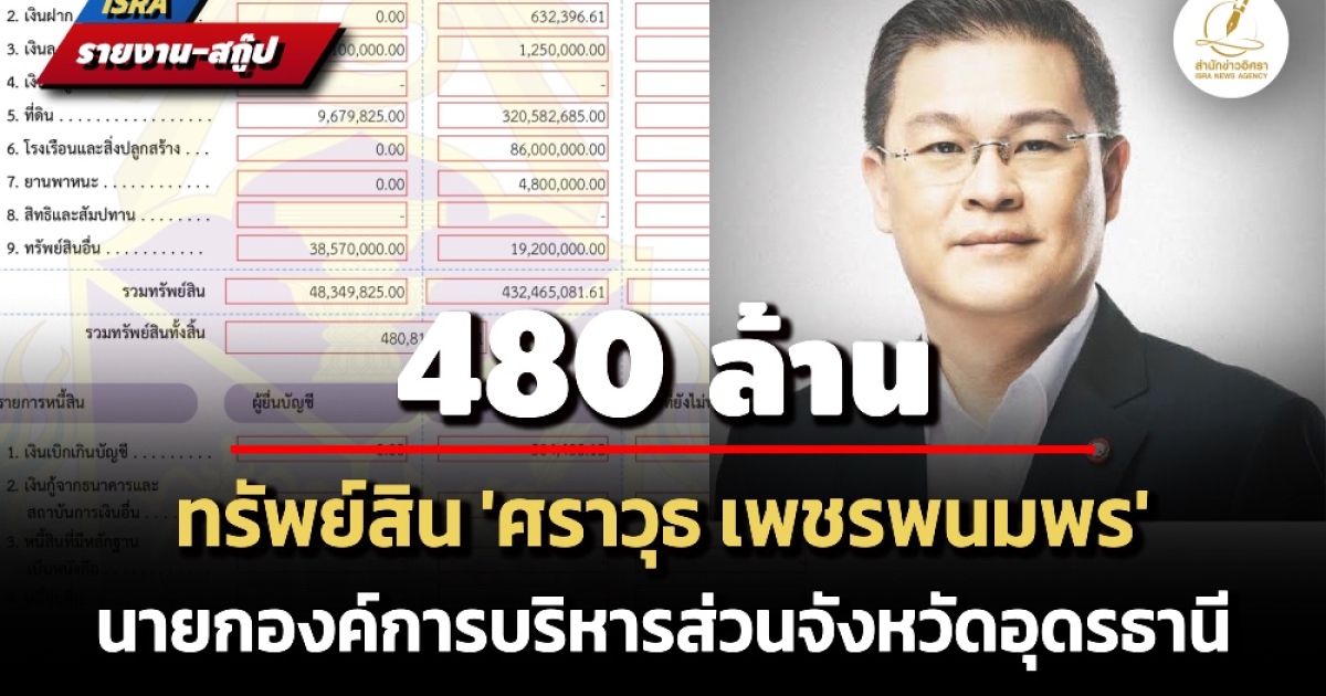 ป.ป.ช. เปิดทรัพย์สินองค์กรปกครองส่วนท้องถิ่น 'ศราวุธ เพชรพนมพร' นายกอบจ.อุดรธานี ทรัพย์สิน 480 ล. สะสมพระเครื่อง 17 องค์ 27 ล. เทียบปี 2562 เพิ่มขึ้น 57 ล.