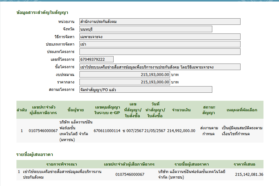 บริษัท แอ็ดวานซ์อินฟอร์เมชั่นเทคโนโลยี จำกัด (มหาชน) ได้รับการคัดเลือก เสนอราคา 215,142,081.36 บาท เป็นผู้มีคุณสมบัติตรงตามเงื่อนไขที่กำหนด