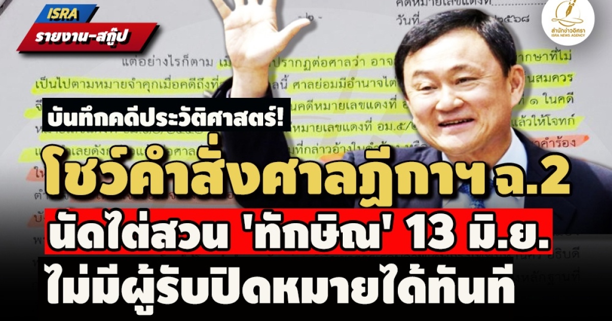 ล่าสุด สำนักข่าวอิศรา ได้รับมอบสำเนาคำสั่งศาลฏีกาฯ คดีนี้ ฉบับที่ 2 เรื่องการแจ้งนัดหมายให้โจทก์ สำนักงานคณะกรรมการป้องกันและปราบปรามการทุจริตแห่งชาติ (ป.ป.ช.) และจำเลย (นายทักษิณ ชินวัตร) แจ้งต่อศาลว่ามีข้อเท็จจริงเป็นอย่างไร กับสำเนาคำร้องให้ผู้บัญชาการเรือนจำพิเศษกรุงเทพมหานคร อธิบดีกรมราชทัณฑ์และนายแพทย์ใหญ่รพ.ตำรวจ ชี้แจงข้อเท็จจริงต่อศาล โดยนัดไต่สวนในวันที่ 13 มิ.ย. 2568 เวลา 9.30 น. จึงขอนำมาบันทึกไว้ ณ ที่นี้ ด้วยเช่นกัน