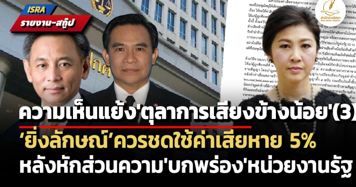 ทั้งหมดนี้เป็นรายละเอียดความ ‘เห็นแย้ง’ ในคดีชดใช้ค่าเสียหายจากกรณีการทุจริตระบาย ‘ข้าวจีทูจี’ 4 สัญญา ซึ่ง ‘ตุลาการเสียงข้างน้อย’ มีความเห็นว่า น.ส.ยิ่งลักษณ์ ชินวัตร ควรชดใช้ค่าเสียหาย 500 ล้านบาท และต้องนำค่าเสียหายในส่วนที่ ‘ผู้กระทำทุจริต’ ระบายข้าวจีทูจี ทั้ง 6 ราย ได้ชดใช้ฯไปแล้ว มาหักลบออกจากส่วนที่ น.ส.ยิ่งลักษณ์ ต้องชดใช้ฯด้วย!