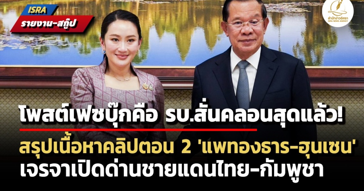 หมายเหตุ สำนักข่าวอิศรา (www.isranews.org) : สืบเนื่องจากที่มีการแชร์คลิปเสียงบนโลกออนไลน์เกี่ยวกับคลิปเสียงสนทนาระหว่าง นางสาวแพทองธาร ชินวัตร นายกรัฐมนตรีกับ สมเด็จฮุน เซน ประธานวุฒิสภากัมพูชา เกี่ยวกับแนวทางการแก้ไขปัญหาความขัดแย้งพื้นที่ระหว่าง 2 ประเทศ ซึ่งคลิปนี้มีการโพสต์ผ่านเฟซบุ๊กชาวกัมพูชารายหนึ่ง ความยาวประมาณ 17 นาที 6 วินาที แต่แชร์คลิปสู่สาธารณะความยาวประมาณ 9 นาที