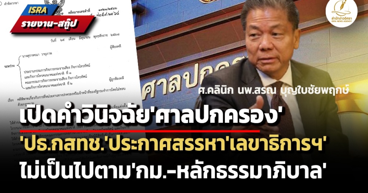 จากกรณีที่เมื่อวันที่ 25 มิ.ย.ที่ผ่านมา ศาลปกครองกลาง ได้มีคำพิพากษาในคดีหมายเลขดำที่ 1921/25661 คดีหมายเลขแดงที่ 1259/2568 ซึ่งเป็นคดีที่ นางสุรางคณา วายุภาพ ผู้สมัครเข้ารับการคัดเลือกเป็นเลขาธิการคณะกรรมการกิจการกระจายเสียง กิจการโทรทัศน์ และกิจการโทรคมนาคมแห่งชาติ (กสทช.) ยื่นฟ้อง ศ.คลินิก นพ.สรณ บุญใบชัยพฤกษ์ ประธาน กสทช. (ผู้ถูกฟ้องค ดีที่ 1) และคณะกรรมการ กสทช. (ผู้ถูกฟ้องคดีที่ 2) ขอให้ศาลมีคำพิพากษาหรือคำสั่งใน 2 ประเด็น ได้แก่
