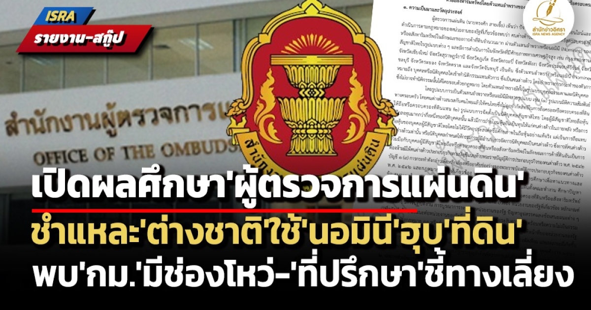 สำนักข่าวอิศรา (www.isranews.org) จึงขอนำเสนอสาระสำคัญ ผลการวินิจฉัยและข้อเสนอแนะของผู้ตรวจการแผ่นดิน กรณีปัญหาการถือครองหรือครอบครองที่ดินหรืออสังหาริมทรัพย์โดยตัวแทนอำพรางของคนต่างด้าว (นอมินี) สรุปได้ดังนี้