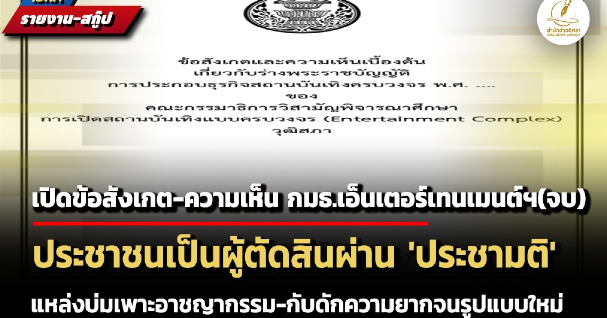 หมายเหตุ : สำนักข่าวอิศรา (www.isranews.org) คณะกรรมาธิการวิสามัญพิจารณาศึกษาการเปิดสถานบันเทิงแบบครบวงจร (Entertainment Complex) วุฒิสภา ที่มีนพ.วีระพันธ์ สุวรรณนามัย เป็นประธาน ได้สรุปรายงานข้อสังเกตและความเห็นเบื้องต้นเกี่ยวกับร่างพระราชบัญญัติ (พ.ร.บ.) การประกอบธุรกิจสถานบันเทิงครบวงจร พ.ศ. เสนอต่อวุฒิสภาเพื่อพิจารณาตามอำนาจหน้าที่ ในการประชุมวุฒิสภา ในวันที่ 7 กรกฎาคม 2568
