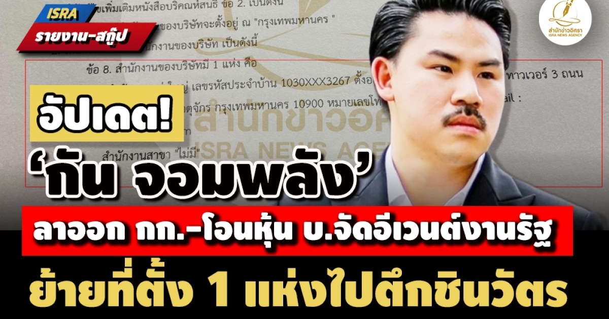 ตามอัปเดต ‘กัน จอมพลัง’ หลังรับงานอีเวนท์-โฆษณา 4 หน่วยงาน ก.เกษตรฯ 5 สัญญายุค ‘ธรรมนัส –นฤมล’ ล่าสุด จดฯลาออก กก.พร้อมโอนหุ้นให้‘หุ้นส่วน’เรียบ 2 บริษัท ขณะที่ ย้ายสนง. ธุรกิจขายวิตามิน อาหารเสริม ไปตึกชินวัตร 3