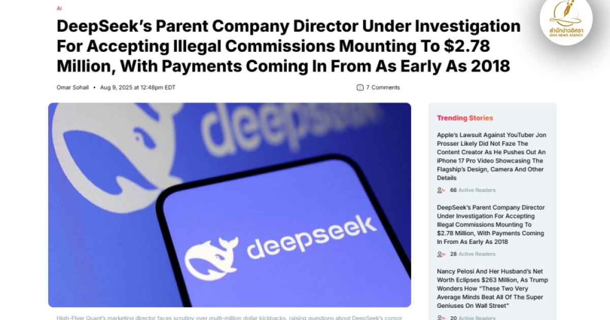 ส่องคดีทุจริตโลก สำนักข่าวอิศรา (www.isranews.org) สัปดาห์นี้ขอนำเสนอกรณีการรับสินบนที่เกี่ยวข้องกับบริปัญญาประดิษฐ์ หรือ AI ชื่อดังของจีนอย่าง DeepSeek