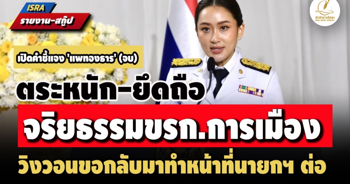 ข้อมูลยังไม่จบ ยังมีรายละเอียดคำชี้แจงเรื่องพันธกิจร่วมของศาลรัฐธรรมนูญและนายกรัฐมนตรีในการธํารงรักษาหลักนิติธรรม กรณีที่ผู้ร้องขอให้ศาลรัฐธรรมนูญมีคําสั่งให้หยุดปฏิบัติหน้าที่จนกว่า ศาลรัฐธรรมนูญจะมีคําวินิจฉัย เมื่อคํานึงถึงสถานการณ์ของประเทศชาติเวลานี้ และ จริยธรรมของข้าราชการการเมือง ที่ น.ส.แพทองธาร นำมาใช้ประกอบการชี้แจงต่อ ศาลรัฐธรรมนูญอีก