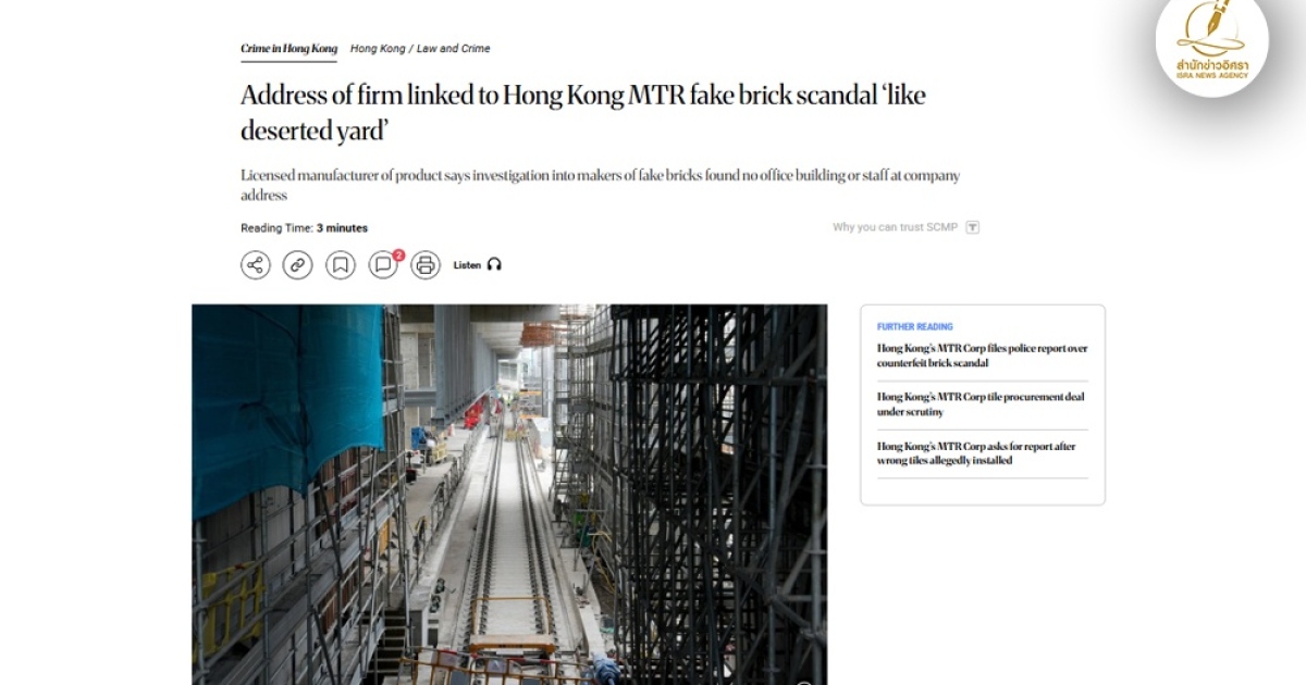 โดยสำนักข่าวเซาธ์ไชน่ามอร์นิ่งโพสต์ รายงานข่าวเกี่ยวกับเรื่องอื้อฉาวกรณีการใช้อิฐปลอมในโครงการก่อสร้างของบริษัท MTR Corporation ในฮ่องกงซึ่งลุกลามบานปลาย
