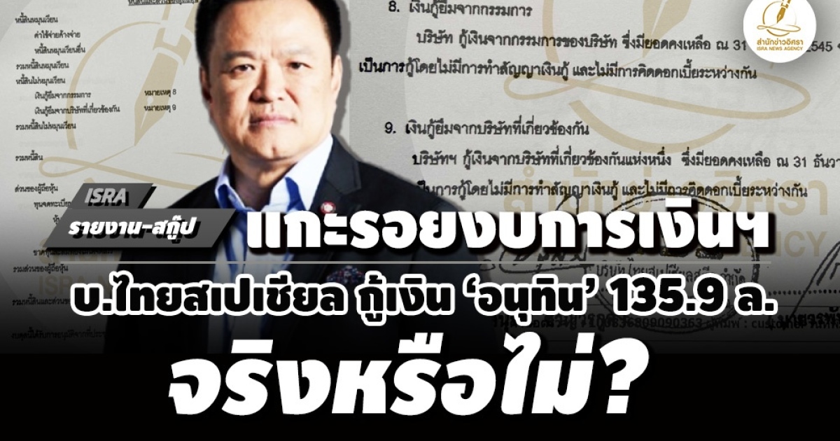 สืบค้นงบการเงินย้อนหลังปี 2545 -2567 บ.ไทยสเปเชียลฯ ลูกหนี้ ‘อนุทิน ชาญวีรกูล’ พบลงรายการหนี้สิน-กู้กก. 155 ล้าน ไม่ทำสัญญา ไม่คิดดอกเบี้ย ไร้หลักประกัน ก่อนนายกฯโชว์ตั๋วสัญญาใช้เงิน 135.9 ล้าน ปี 2551 ในบัญชีฯ ป.ป.ช. ไขข้อสงสัย กู้ยืมกันจริงหรือไม่ ไฉนไม่คิดดอกเบี้ย ไม่มีหลักประกัน ?