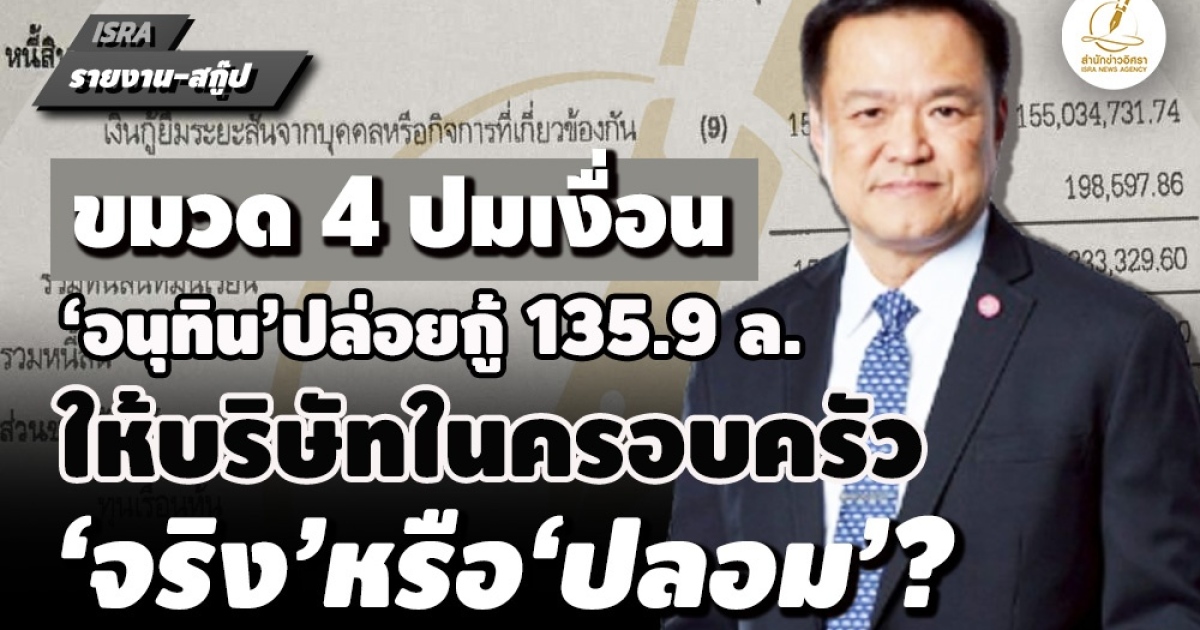 ขมวด 4 ปมเงื่อน ‘อนุทิน ชาญวีรกูล’นายกฯ ให้กู้ยืม 135.9 ล. บริษัทไม่ได้ประกอบการ กก./หุ้นใหญ่คนในบริษัทครอบครัว แบบไม่คิดดอกเบี้ย ไร้หลักประกัน บนข้อสงสัย จริง-ไม่จริง?