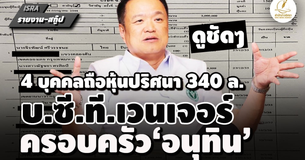 ล่าสุด สำนักข่าวอิศรา สรุปข้อมูลการถือครองหุ้นบริษัท ซี.ที. เวนเจอร์ จำกัด ของบุคคล 4 ราย ประกอบเอกสารบัญชีรายชื่อผู้ถือหุ้น (บอจ.5) มารายงานอย่างชัด ๆ