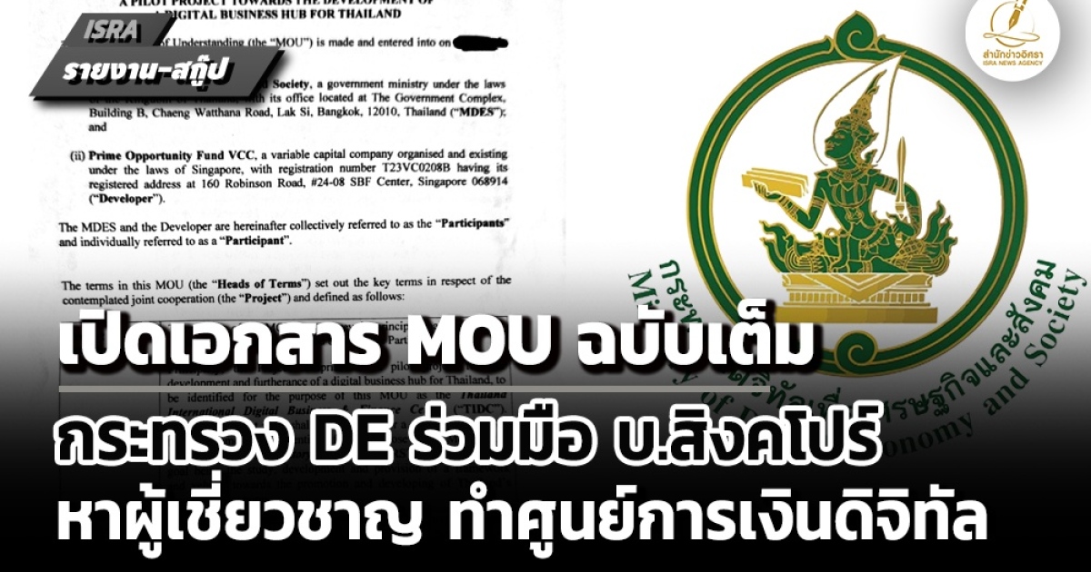 ทั้งหมดนี้ เป็นรายละเอียดฉบับเต็ม ในบันทึกความเข้าใจ หรือ MOU ระหว่าง กระทรวงพัฒนาเศรษฐกิจและสังคมหรือดีอี กับบริษัทสิงคโปร์ชื่อว่า Prime Opportunity Fund VCC ที่นายทอม ไรต์ อ้างว่านายเบนจามิน เมาเออร์เบอร์เกอร์ หรือเบน สมิธ บุคคลที่อยู่ในรายชื่อร่างกฎหมายของสหรัฐอเมริกา เพื่อคว่ำบาตรกลุ่มสแกมเมอร์ มีความเกี่ยวข้องกับบริษัทนี้ ที่สำนักข่าวอิศรา ตรวจสอบพบล่าสุด