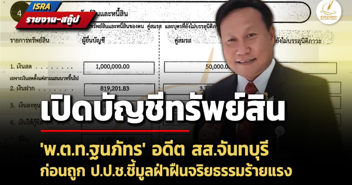 พ.ต.ท. ฐนภัทร พร้อมด้วย นางศิริวรรณ กิตติวงศา คู่สมรส และบุตรที่ยังไม่บรรลุนิติภาวะ แจ้งมีทรัพย์สินทั้งสิ้น 60,066,975.50 บาท มีหนี้สินทั้งสิ้น 2,436,934.29 บาท