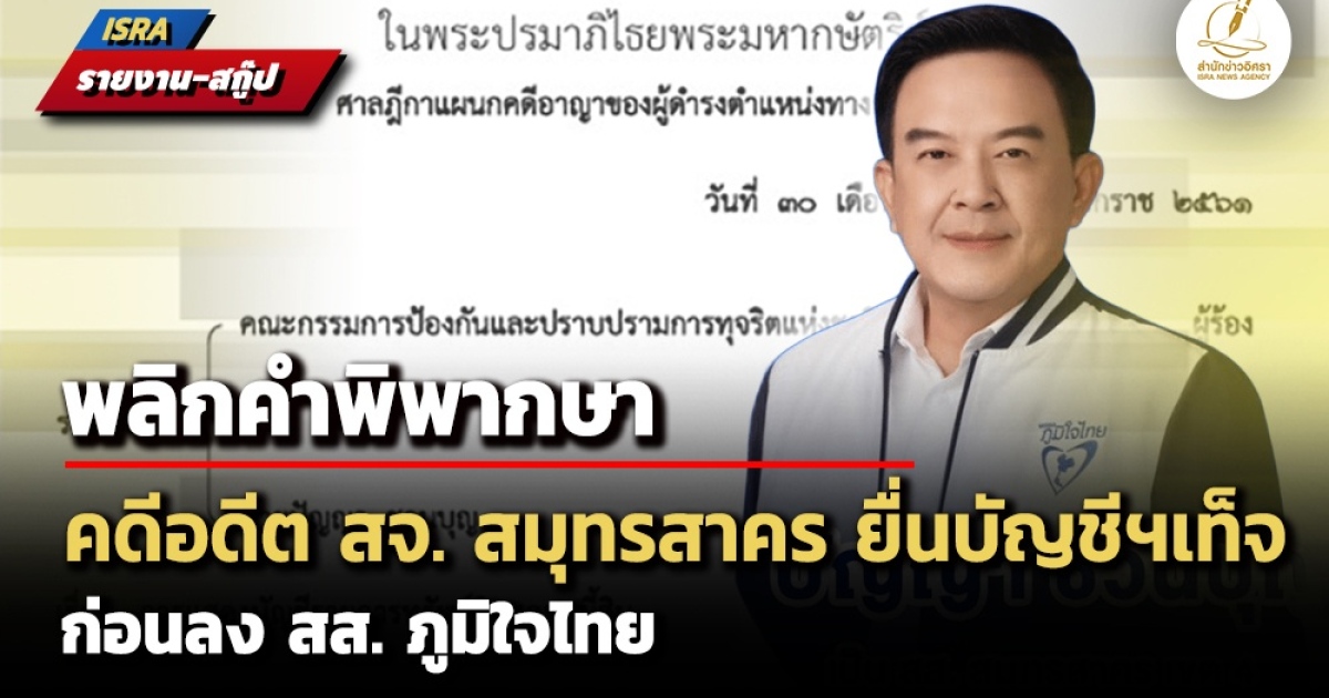 พลิกคำพิพากษาศาลฎีกา คดีอดีต ปธ.สภา อบจ.สมุทรสาคร ยื่นบัญชีทรัพย์สินเท็จ ห้ามดำรงตำแหน่งการเมือง 5 ปีนับแต่ 20 เม.ย.2555 จำคุก 1 เดือน ปรับ 4,000 บาท รอลงโทษ 1 ปี คำร้อง ป.ป.ช. ไม่แจ้งถือครองหุ้น 2 บริษัท มูลค่า 1.1 ล. ล่าสุดเป็นผู้สมัคร สส. ภูมิใจไทย ผ่านตรวจสอบคุณสมบัติ ผอ.ประจำเขต กกต. ไม่มีลักษณะต้องห้าม