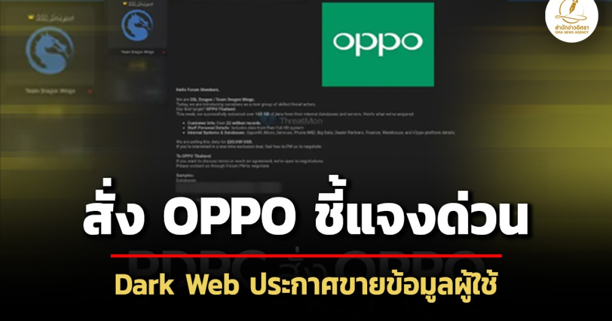 PDPC สั่ง OPPO ชี้แจงด่วน กรณี Dark Web อ้างขายข้อมูลผู้ใช้-ข้อมูลภายในองค์กร กว่า 165 GB ภายใน 72 ชม.