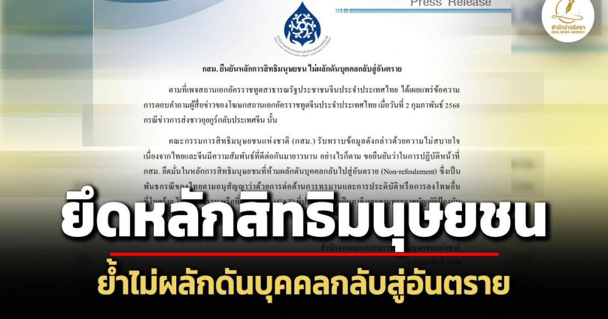 คณะกรรมการสิทธิมนุษยชนแห่งชาติ (กสม.) รับทราบข้อมูลดังกล่าวด้วยความไม่สบายใจ เนื่องจากไทยและจีนมีความสัมพันธ์ที่ดีต่อกันมายาวนาน อย่างไรก็ตาม ขอยืนยันว่าในการปฏิบัติหน้าที่ กสม. ยึดมั่นในหลักการสิทธิมนุษยชนที่ห้ามผลักดันบุคคลกลับไปสู่อันตราย (Non-refoulement) ซึ่งเป็นพันธกรณีของไทยตามอนุสัญญาว่าด้วยการต่อต้านการทรมานและการประติบัติหรือการลงโทษอื่นที่โหดร้าย ไร้มนุษยธรรม หรือที่ย่ำยีศักดิ์ศรี (CAT) ที่ประเทศไทยเป็นภาคี และตามพระราชบัญญัติป้องกันและปราบปรามการทรมานและการกระทำให้บุคคลสูญหาย พ.ศ. 2565