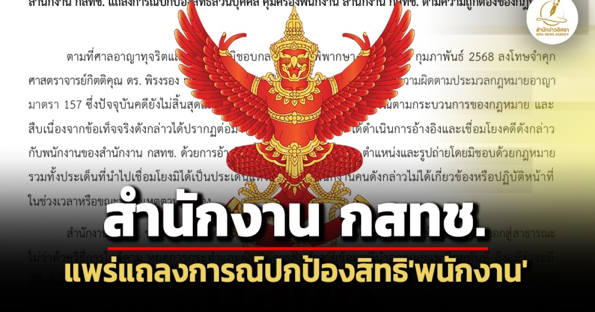 ‘สำนักงาน กสทช.’ แพร่แถลงการณ์ ปกป้อง ‘พนักงาน’ ถูกอ้างอิง ‘ชื่อ-นามสกุล-รูปถ่าย’ โดยมิชอบ เชื่อมโยงคดี ‘พิรงรอง’ ชี้ ‘พนักงานรายนี้’ ไม่ได้เกี่ยวข้อง-ปฏิบัติหน้าที่ ขณะเกิดเหตุตามมูลฟ้อง