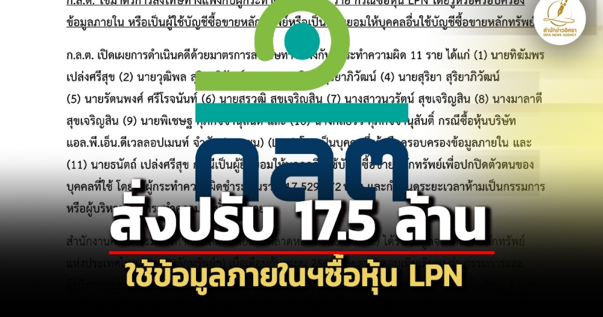 กรณีซื้อหุ้นบริษัท แอล.พี.เอ็น.ดีเวลลอปเมนท์ จำกัด (มหาชน) (LPN) โดยเป็นบุคคลซึ่งรู้หรือครอบครองข้อมูลภายใน และ (11) นายธนัตถ์ เปล่งศรีสุข กรณีเป็นผู้ยินยอมให้บุคคลอื่นใช้บัญชีซื้อขายหลักทรัพย์เพื่อปกปิดตัวตนของบุคคลที่ใช้ โดยให้ผู้กระทำความผิดชำระเงินรวม 17,529,772 บาท และกำหนดระยะเวลาห้ามเป็นกรรมการหรือผู้บริหารกับผู้กระทำความผิดทั้ง 11 ราย