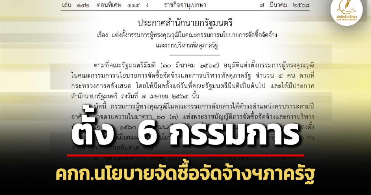 ราชกิจจาฯแพร่ประกาศแต่งตั้งกรรมการผู้ทรงคุณวุฒิในคณะกรรมการนโยบายการจัดซื้อจัดจ้างและการบริหารพัสดุภาครัฐ 6 ราย