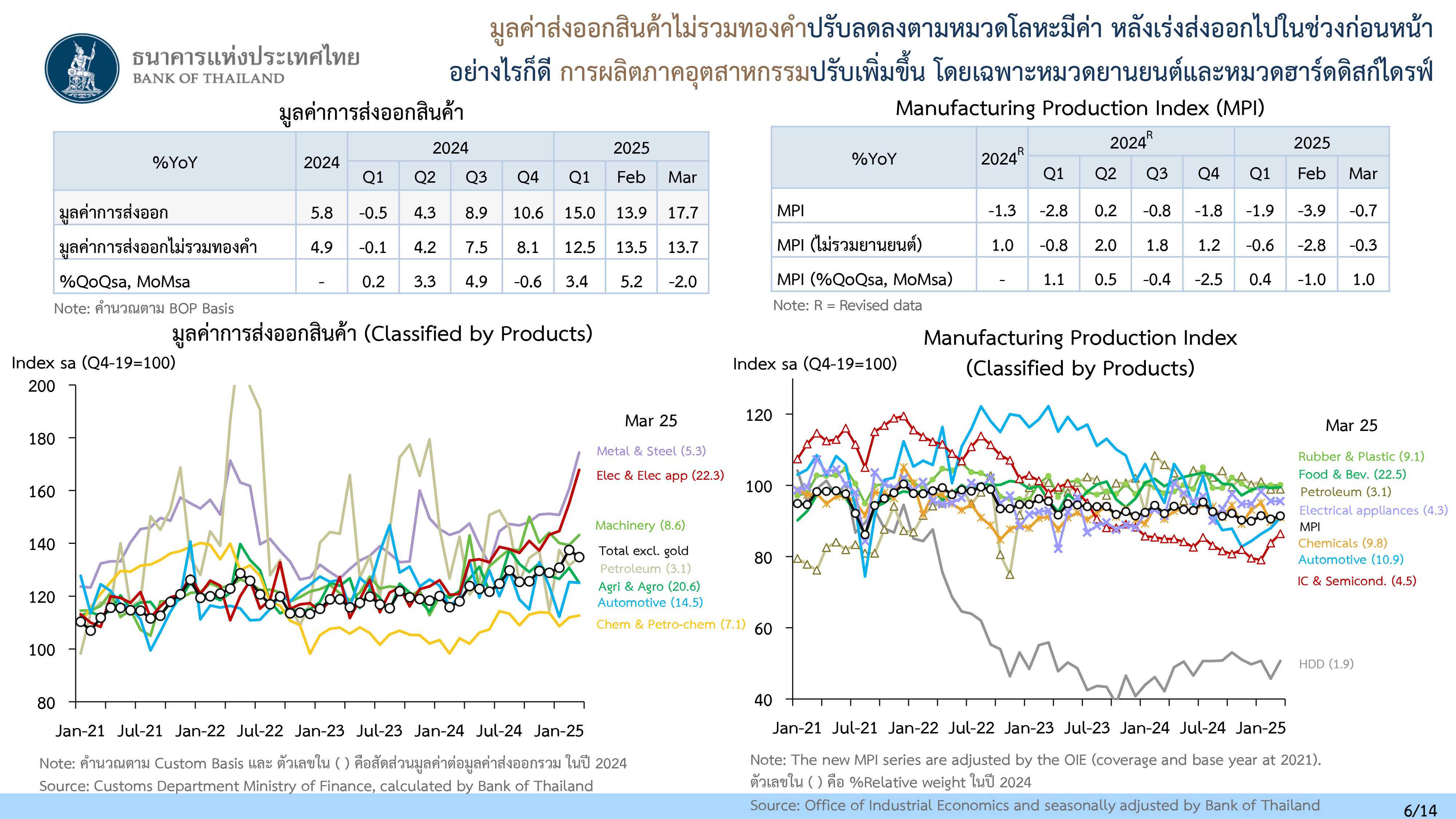 อย่างไรก็ดี การส่งออกในบางหมวดปรับเพิ่มขึ้นมาก อาทิ หมวดอิเล็กทรอนิกส์ โดยเฉพาะอุปกรณ์สื่อสารโทรคมนาคม คอมพิวเตอร์ และฮาร์ดดิสก์ไดรฟ์ ตามการเร่งส่งออกไปสหรัฐฯ จากความกังวลต่อการขึ้นภาษีนำเข้าของสหรัฐฯ และหมวดโลหะ ตามการส่งออกโลหะอื่นๆ ไปนอร์เวย์