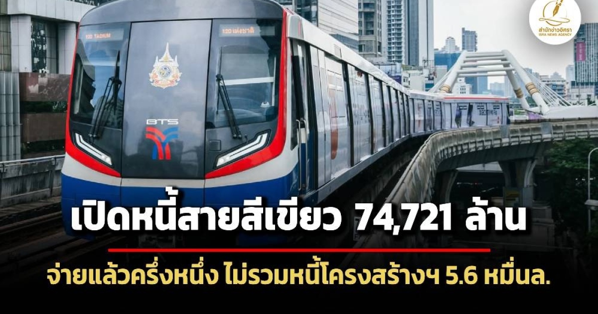กทม.เปิดเผยหนี้รถไฟฟ้าสายสีเขียววงเงิน 74,721 ล้านบาท จ่ายไปแล้ว 37,476 ล้านบาท ยังเหลืออีก 37,245 ล้านบาท ชี้หนี้ดังกล่าวยังไม่รวมหนี้งานโครงสร้างพื้นฐานระหว่างกทม.กับกระทรวงการคลังอีก 5.6 หมื่นล้านบาท