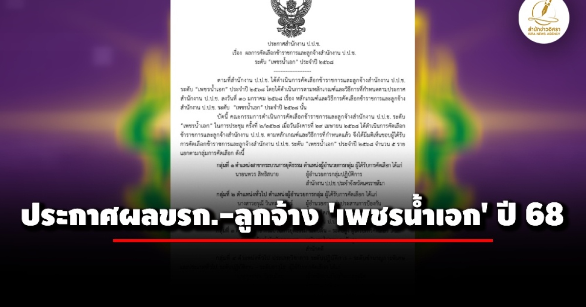 บัดนี้ คณะกรรมการดําเนินการคัดเลือกข้าราชการและลูกจ้างสํานักงาน ป.ป.ช. ระดับ “เพชรน้ําเอก” ในการประชุม ครั้งที่ 2/2568 เมื่อวันอังคารที่ 29 เมษายน 2568 ได้ดําเนินการคัดเลือก ข้าราชการและลูกจ้างสํานักงาน ป.ป.ช. ตามหลักเกณฑ์และวิธีการที่กําหนดแล้ว จึงได้มีมติเห็นชอบผู้ได้รับ การคัดเลือกข้าราชการและลูกจ้างสํานักงาน ป.ป.ช. ระดับ “เพชรน้ําเอก” ประจําปี 2568 จํานวน 5 ราย แยกตามกลุ่มการคัดเลือก ดังนี้
