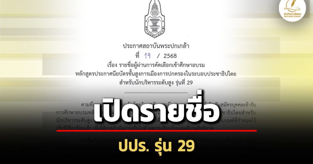 สำนักข่าวอิศรา (www.isranews.org) รายงานว่า เมื่อวันที่ 13 พ.ค. 2568 สถาบันพระปกเกล้า ได้ออกประกาศ รายชื่อผู้ที่ผ่านการคัดเลือกเข้าศึกษาอบรมหลักสูตรประกาศนียบัตรชั้นสูง การเมืองการปกครอง ในระบอบประชาธิปไตย สำหรับนักบริหารระดับสูง รุ่นที่ 29 โดยมีรายชื่อบรรดานักการเมือง นักธุรกิจ และข้าราชการ รวม 160 คน และมีรายชื่อสำรอง 20 คน