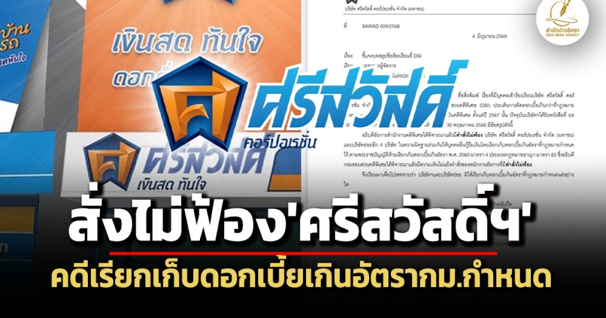 สำนักข่าวอิศรา (www.isranews.org) รายงานว่า เมื่อวันที่ 4 มิ.ย.ที่ผ่านมา บมจ.ศรีสวัสดิ์ คอร์ปอเรชั่น หรือ SAWAD แจ้งตลาดหลักทรัพย์ฯ ว่า ตามที่ปรากฏข่าวในสื่อออนไลน์ และสื่อสิ่งพิมพ์ เรื่องที่มีบุคคลเข้าร้องเรียนบริษัท ศรีสดิ์ คอร์ปอเรชั่น จำกัด (มหาชน) และบริษัทย่อย ต่อกรมสอบสวนคดีพิเศษ (DSI) ประเด็นการคิดดอกเบี้ยเกินกว่าที่กฎหมายกำหนด และกรมสอบสวนคดีพิเศษได้รับเรื่องดังกล่าวเป็นคดีพิเศษ ตั้งแต่ปี 2567 นั้น ปัจจุบันบริษัทฯได้รับหนังสือที่ ยธ 0824/1950 จากกรมสอบสวนคดีพิเศษแล้วตั้งแต่วันที่ 30 พ.ค.2568 มีข้อสรุป ดังนี้