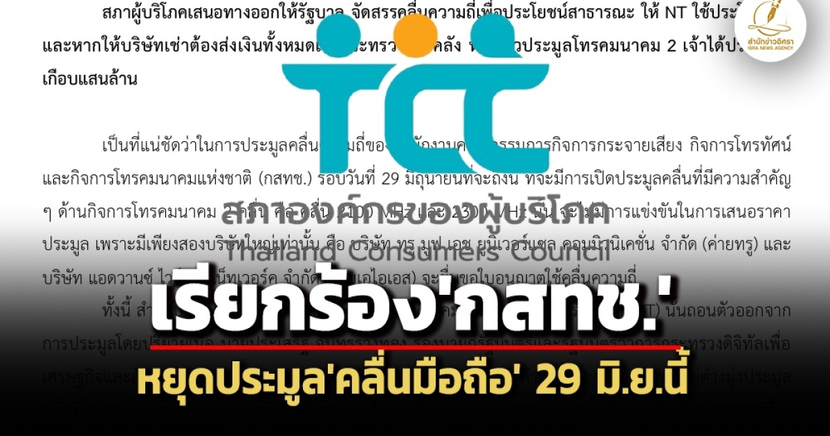 ‘สภาผู้บริโภค’ แพร่ข่าวเรียกร้อง ‘กสทช.’ ประมูล ‘คลื่นมือถือ’ 29 มิ.ย.นี้ ชี้ส่อเอื้อประโยชน์ ‘บริษัทโทรคมนาคม ยักษ์ใหญ่’ 2 เจ้า ผูกขาด-มีอำนาจเหนือตลาด