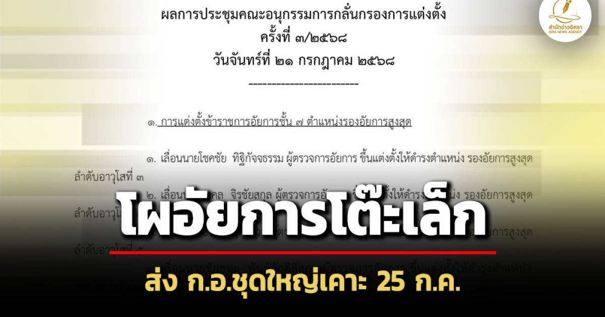 สำนักข่าวอิศรา (www.isranews.org) รายงานว่า เมื่อวันที่ 21 ก.ค.2568 ที่ประชุมคณะอนุกรรมการกลั่นกรองเเละแต่งตั้ง (โต๊ะเล็ก) ครั้งที่ 3/2568 ได้มีการพิจาณาบัญชีแต่งตั้งข้าราชการอัยการตั้งเเต่ตําแหน่งรองอัยการสูงสุดลงมาถึงอัยการอาวุโส รวมทั้งสิ้น 847 ตำเเหน่ง