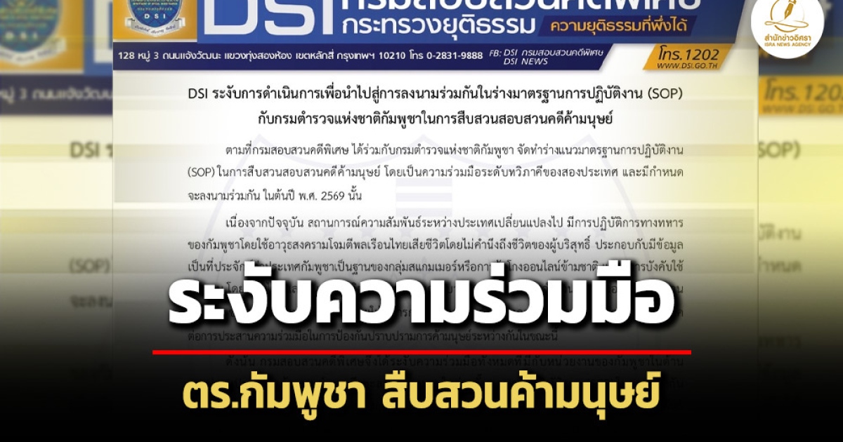 DSI ระงับการดำเนินการเพื่อนำไปสู่การลงนามร่วมกันในร่างมาตรฐานการปฏิบัติงาน (SOP) กับกรมตำรวจแห่งชาติกัมพูชาในการสืบสวนสอบสวนคดีค้ามนุษย์