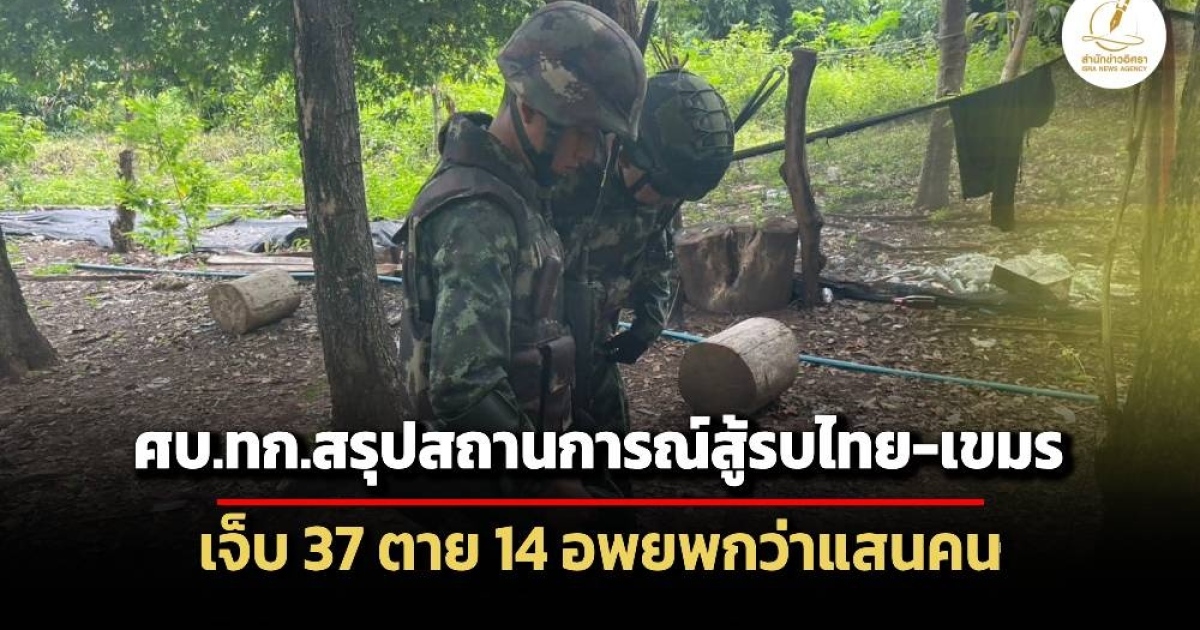 ศบ.ทก.สรุปสถานการณ์การสู้รบระหว่างไทย-กัมพูชา ชี้ 5 พื้นที่สำคัญ 'ช่องบก-ภูผีปราสาทโดนตวล-เขาพระวิหาร-ช่องจอม-ปราสาทตาเมือนถม' ตรึงกำลังได้หมด ส่วนตัวเลขผู้บาดเจ็บอยู่ที่ 37 ราย ตาย 14 คน อพยพอีก 130,000 คน