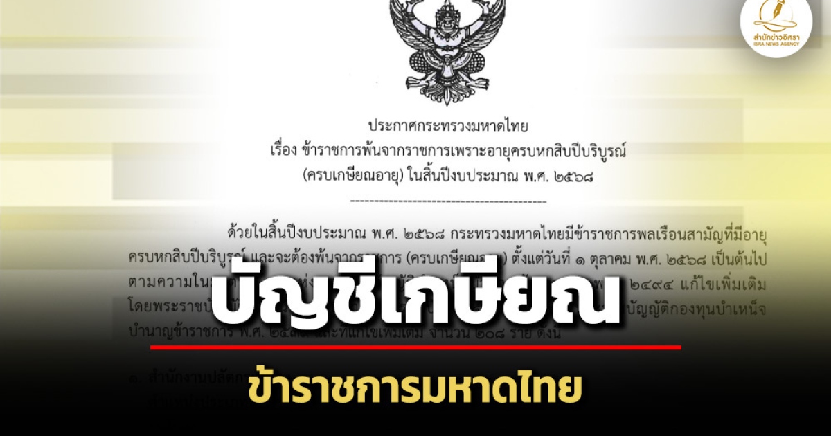 สำนักข่าวอิศรา (www.isranews.org) รายงานว่า เมื่อวันที่ 2 สิงหาคม 2568 กระทรวงมหาดไทย ออกประกาศ เรื่อง ข้าราชการพ้นจากราชการเพราะอายุครบ 60 ปี บริบูรณ์ (ครบเกษียณอายุ) ในสิ้นปีงบประมาณ 2568 คือ ตั้งแต่ 1 ตุลาคม 2568 จำนวน 208 ราย