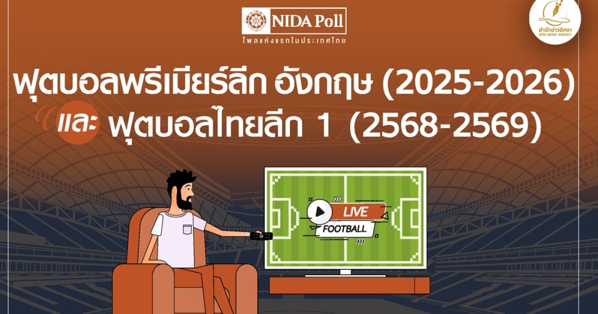 สำนักข่าวอิศรา (www.isranews.org) รายงานว่าเมื่อวันที่ 3 ส.ค.ศูนย์สำรวจความคิดเห็น “นิด้าโพล” สถาบันบัณฑิตพัฒนบริหารศาสตร์ (นิด้า) เปิดเผยผลการสำรวจ เรื่อง “ฟุตบอลพรีเมียร์ลีก อังกฤษ 2025-2026 และฟุตบอลไทยลีก 1 ฤดูกาล 2568-2569” ทำการสำรวจระหว่างวันที่ 29 กรกฎาคม - 1 สิงหาคม 2568 จากประชาชนที่มีอายุ 15 ปีขึ้นไป กระจายทุกภูมิภาค ระดับการศึกษา อาชีพ และรายได้ ทั่วประเทศ รวมจำนวนทั้งสิ้น 2,500 หน่วยตัวอย่าง เกี่ยวกับการติดตามฟุตบอลพรีเมียร์ลีก อังกฤษ 2025-2026 และฟุตบอลไทยลีก 1 ฤดูกาล 2568-2569 การสำรวจอาศัยการสุ่มตัวอย่างโดยใช้ความน่าจะเป็นจากบัญชีรายชื่อฐานข้อมูลตัวอย่างหลัก (Master Sample) ของ “นิด้าโพล” สุ่มตัวอย่างแบบหลายขั้นตอน (Multi-stage Sampling) เก็บข้อมูลด้วยวิธีการสัมภาษณ์ทางโทรศัพท์ โดยกำหนดค่าความคลาดเคลื่อนไม่เกิน 0.05 ที่ระดับความเชื่อมั่น ร้อยละ 97.0