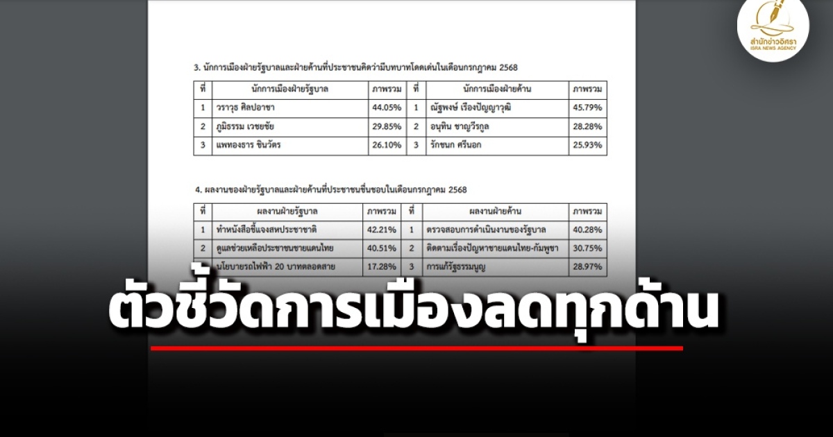 ผลงานของฝ่ายรัฐบาลและฝ่ายค้านที่ประชาชนชื่นชอบในเดือนกรกฎาคม 2568